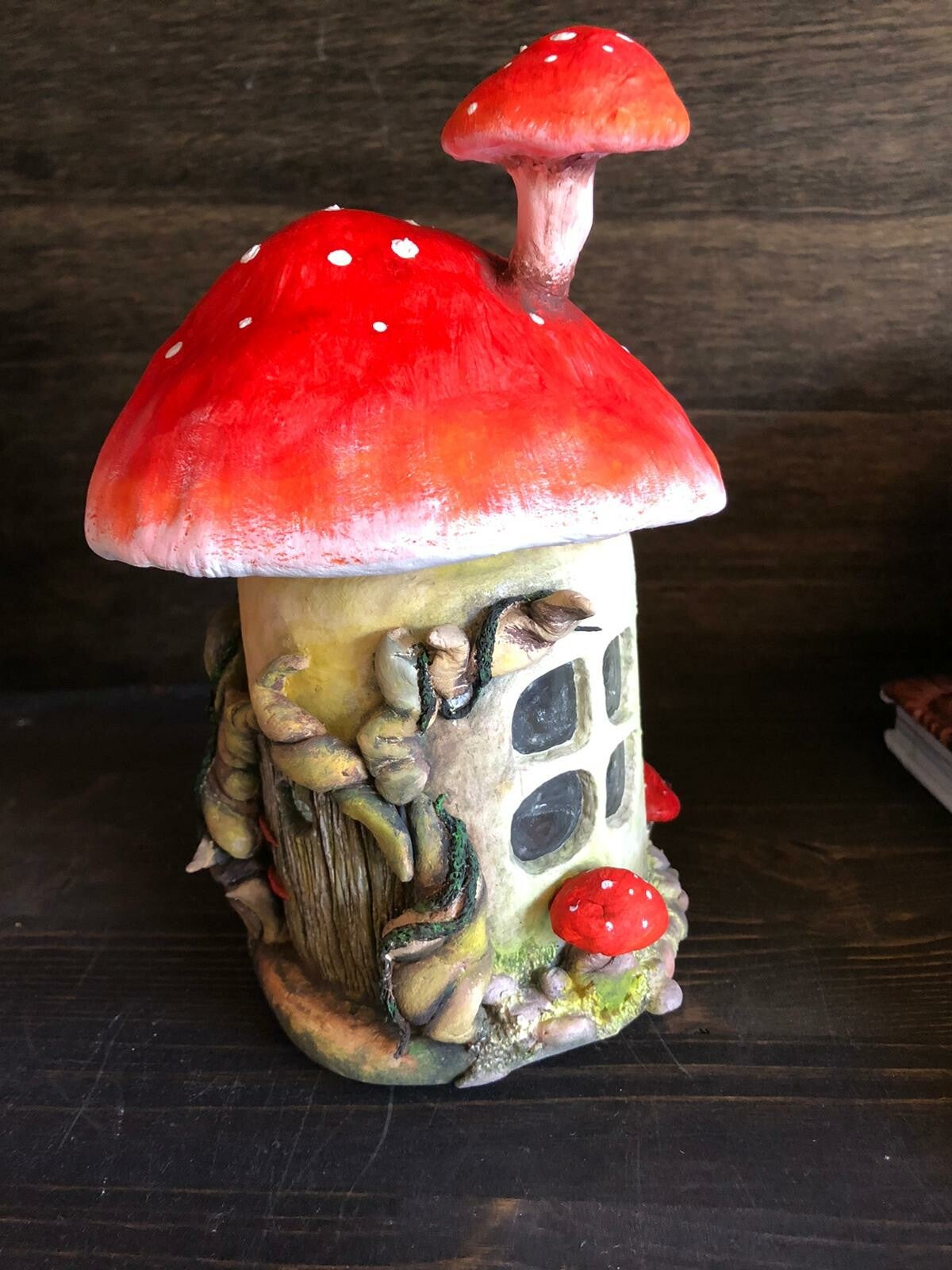 De kleihuisjes van Marcia. Zomaar een greep uit de vele huisjes die ze gemaakt heeft. Ze zijn erg kwetsbaar dus regelmatig is er een huisje gesneuveld. Het leuke is dat de hoed er vanaf kan worden gehaald en dat er een lampje in geplaatst kan worden. Dat ziet er heel gezellig uit.